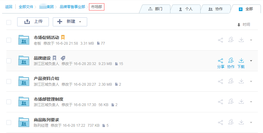 部門間存在信息孤島,彼此共享信息不及時,溝通成本太高。比如產(chǎn)品部門推出新產(chǎn)品,需要與市場部/銷售部共享大量的產(chǎn)品資料。市場部根據(jù)資料制定宣傳手冊、促銷活動、培訓(xùn)資料等,并將這些資料共享給銷售部。這個過程中大量的文件協(xié)作和信息傳遞以QQ、郵件的方式來共享,會導(dǎo)致文件不能實時獲取、版本不同步、信息錯漏等問題。