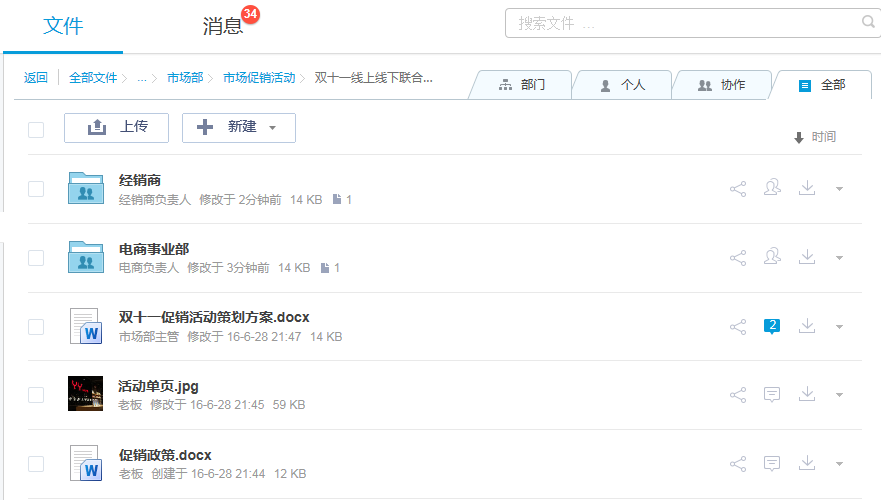 部門間存在信息孤島,彼此共享信息不及時,溝通成本太高。比如產(chǎn)品部門推出新產(chǎn)品,需要與市場部/銷售部共享大量的產(chǎn)品資料。市場部根據(jù)資料制定宣傳手冊、促銷活動、培訓(xùn)資料等,并將這些資料共享給銷售部。這個過程中大量的文件協(xié)作和信息傳遞以QQ、郵件的方式來共享,會導(dǎo)致文件不能實時獲取、版本不同步、信息錯漏等問題。