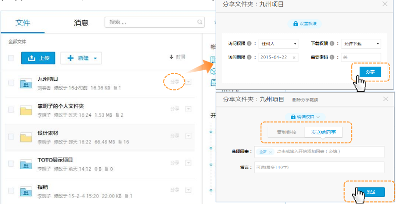 ? ? ? ? 3、分享文件(夾)點擊文件(夾)右側分享圖標,按照需求設置權限后點擊“分享”生成鏈接,客戶可以通過此鏈接直接訪問該文件(夾)。如果要發給同事,可以切換到“發送給同事”進行發送。