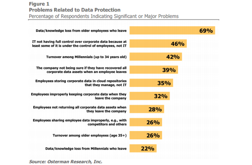 美國奧斯特曼研究公司(Osterman Research)在2016年的一份白皮書報(bào)告中,對(duì)北美187位來自IT/HR領(lǐng)域的人員深入調(diào)查,分析員工離職對(duì)企業(yè)信息安全的影響,詳情請(qǐng)見下表: